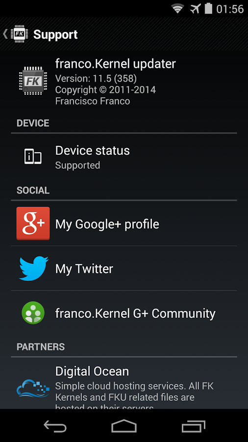 Description![]() Required OS: Requires Android 4.0.3 And Up ![]() NOTE: Should Be Used Only On the Devices having Franco Kernel (see List Of Supported Devices in the Description) ![]() Name Of The App: franco.Kernel updater Google Play Link: franco.Kernel updater Description: A well established top-100 paid app with one of the highest ratings on the Play Store! With a beautiful UI it combines a series of powerful tools to manage your device with franco.Kernel. It's simply the best tool of its kind - managing the Kernel parameters has never been more fun and easy! Take note that your device needs to be ROOTED. I don't accept refunds if you fail to read this warning. This application supports the following devices only: * Galaxy Nexus * Asus Google Nexus 7 2012 * Asus Google Nexus 7 2013 * LG Nexus 4 * LG Nexus 5 * Samsung Nexus 10 * One Plus One Supports Android from JellyBean (4.1) up to KitKat (4.4). Functionalities: * Deep integration with franco.Kernel * Check for new franco.Kernel versions * Auto flash Kernels directly into the device without any user input besides requiring a reboot * Download .zips to be flashed in recovery * Beautiful UI that follows Google's Guidelines using a great looking navigation drawer * Interface to change CPU clocks and governor * Interface to change the CPU governor parameters * Backup & Restore Kernels on the fly without any "geek" knowledge * Custom Kernel settings such as: IO scheduler, IO scheduler tuning, TCP congestion algorithm and options to turn logging off * A powerful tool called PerApp Settings which you can set special sets of options for your favorite apps. For example you want maximum CPU freq when gaming, but low frequency when reading a e-book. With this tool that is possible. Its also very flexible. * A System Monitor with a beautiful UI courtesy of the developer Christian Göllner * A simple File Manager to flash boot.imgs and Kernel .zips on the go from anywhere inside the sdcard * Color and Sound control for selected devices pending Kernel support * CPU temperature available in the notification bar * Many more options If you desire to help out with the app translations please visit this Crowdin link: https://crowdin.net/project/francokernel_updater Banner and icon courtesy of Lab75 *DISCLAIMER* I take no responsibility for any fault or damage caused by any procedures of the app. No warranties of any kind are given. Screenshots: ![]() Related Torrents